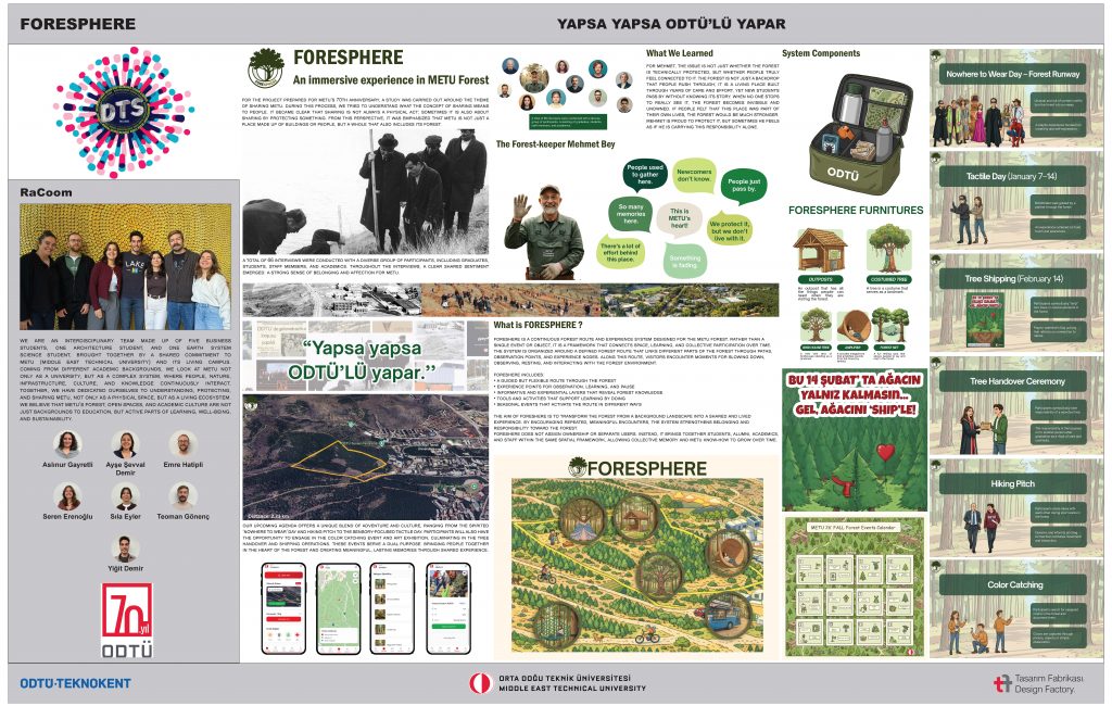 FORESPHERE, ODTÜ Ormanı’nı deneyimlenen, yaşayan ve dönüşen bir mekân olarak ele alan deneyim odaklı bir sistem projesidir. Proje kapsamında, kampüs mescidinden başlayan yaklaşık 2,5 km’lik bir pilot orman rotası tasarlanmıştır. Bu rota üzerinde, ziyaretçilerin ormanı çok boyutlu deneyimlemesini sağlayan orman mobilyaları yer almaktadır. Ziyaretçilere sunulan orman kitleri, deneyimi daha güvenli ve erişilebilir hâle getirirken; düzenlenen etkinlikler, ormanın tekrar tekrar ziyaret edilmesini teşvik eder. Projenin dijital arayüzü ise rota ve etkinlik takibi, acil durum erişimi gibi destekleyici işlevler sunar. FORESPHERE, ODTÜ Ormanı ile insanlar arasındaki bağı güçlendirmeyi hedefleyen bütüncül bir deneyim sistemidir.