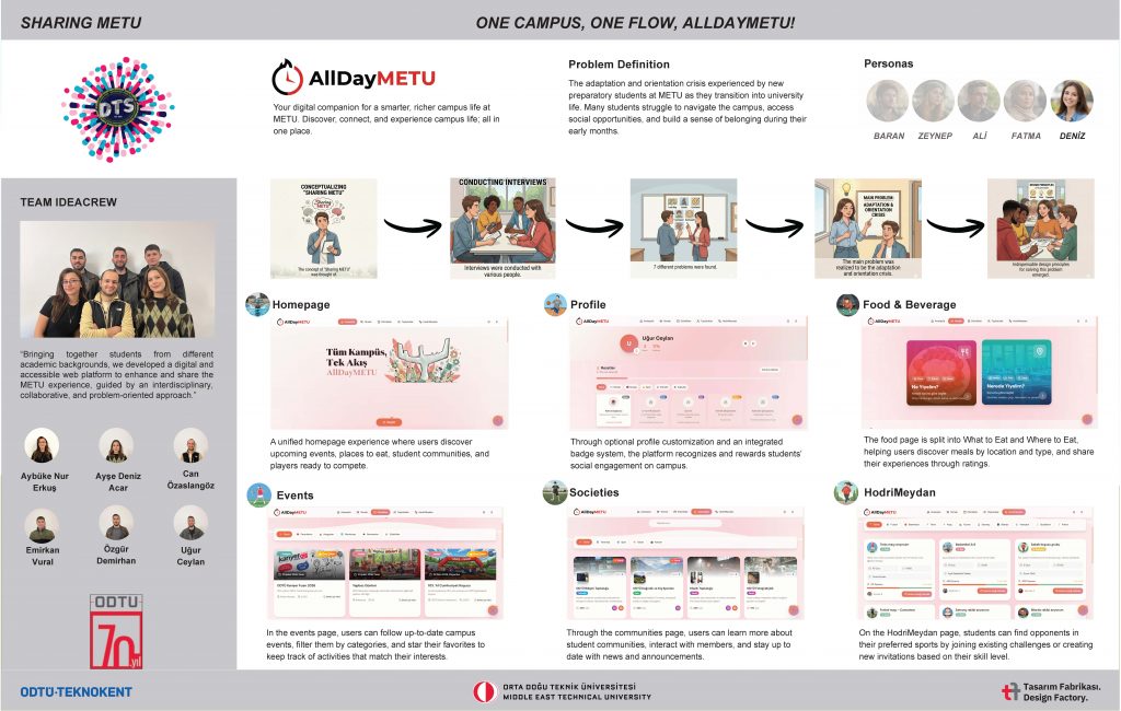 AllDayMETU, kampüs yaşamındaki seçenek fazlalığının yarattığı karar yorgunluğunu azaltmak için tasarlanmış bir dijital platformdur. Proje, METU’de etkinlikler, öğrenci kulüpleri, yeme-içme ve sosyal alanlar arasında seçim yapmayı kolaylaştırmayı hedefler. Platform; akıllı filtrelerle keşif, öğrenci kaynaklı değerlendirmelerle doğrulama ve şeffaf, sansürsüz bilgiye erişim olmak üzere üç temel ilke üzerine kuruludur. Tüm kampüs olanaklarını tek ve kürate edilmiş bir arayüzde birleştirerek bilişsel yükü azaltır, güveni güçlendirir ve aidiyet hissini destekler. AllDayMETU, daha odaklı ve bağlantılı bir kampüs deneyimi sunmayı amaçlayan bir ODTÜ dijital deneyim projesidir.