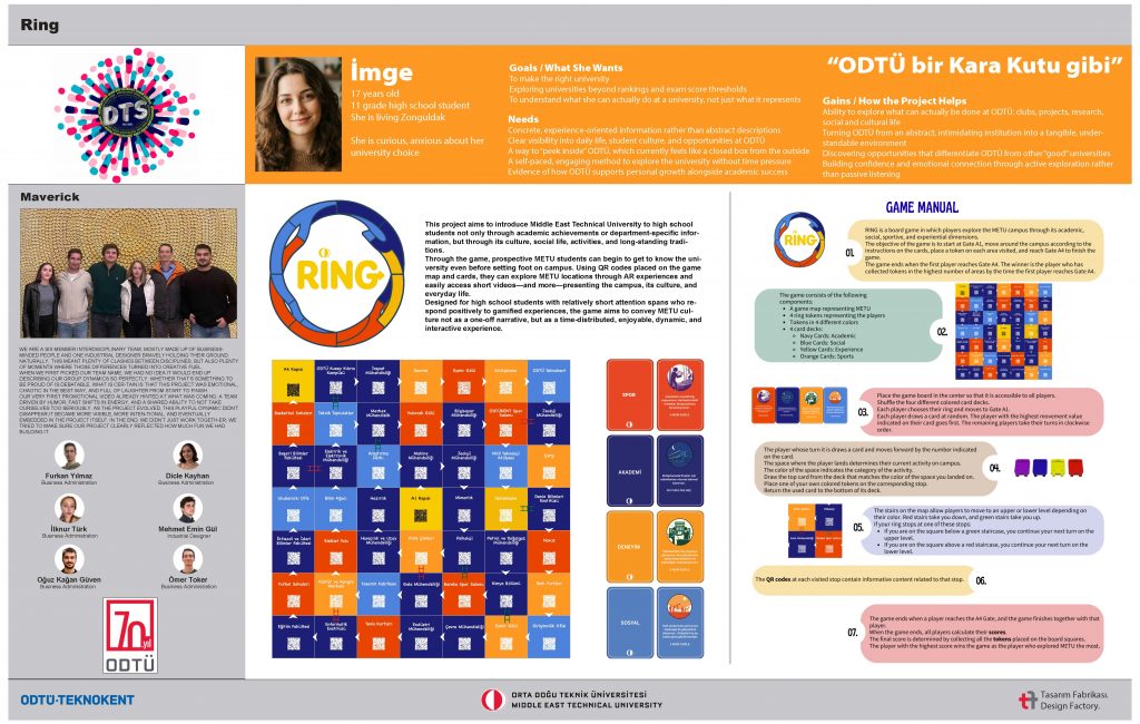 RING, üniversite adaylarının ODTÜ’yü yalnızca akademik yönüyle değil, kampüs yaşamıyla birlikte deneyimlemesini amaçlayan deneyim odaklı bir masa oyunudur. Oyun, adayların kampüs hayatını adım adım keşfetmesini sağlayarak üniversiteyi bir “kara kutu” olmaktan çıkarır. Oyuncular, kampüs kapıları arasında ilerlerken akademik, sosyal, spor ve deneyim alanlarında seçimler yapar; zaman yönetimi, denge ve önceliklendirme gibi gerçekçi kararlarla karşılaşır. Amaç oyunu hızlıca bitirmek değil, kampüsü bilinçli şekilde keşfetmektir. RING, pasif bilgilendirme araçlarının aksine aktif katılım sunarak tercih sürecindeki stresi azaltır ve adayların daha bilinçli kararlar vermesini destekler.