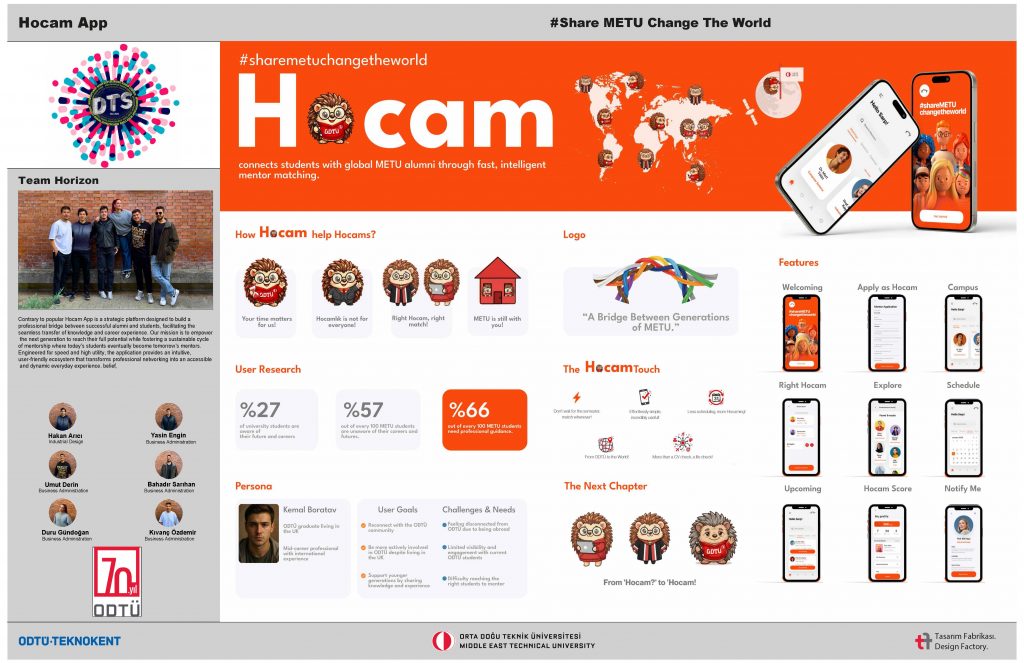 Hocam App, ODTÜ öğrencileri ile dünyanın dört bir yanındaki ODTÜ mezunlarını dijital bir platformda buluşturan bir mentorluk uygulamasıdır. Uygulama, ODTÜ’ye özgü “hocamlık” kültürünü dijital ortama taşıyarak mezun–öğrenci etkileşimini erişilebilir ve sürdürülebilir hâle getirmeyi amaçlar. Öğrenciler; ilgi alanları, kariyer hedefleri, çalışmak istedikleri kurumlar ve ülkeler gibi kriterlere göre mezunlarla birebir eşleştirilir ve deneyime dayalı sorularına doğrudan yanıt alır. Yalnızca bu etkileşim için tasarlanan platform, genel profesyonel ağlardan ayrışır. Test edilmiş ve kullanılabilir durumda olan Hocam App, nesiller arası bilgi aktarımını güçlendirerek belirsizliği azaltmayı ve ODTÜ topluluğu için küresel bir networking alanı oluşturmayı hedefler.