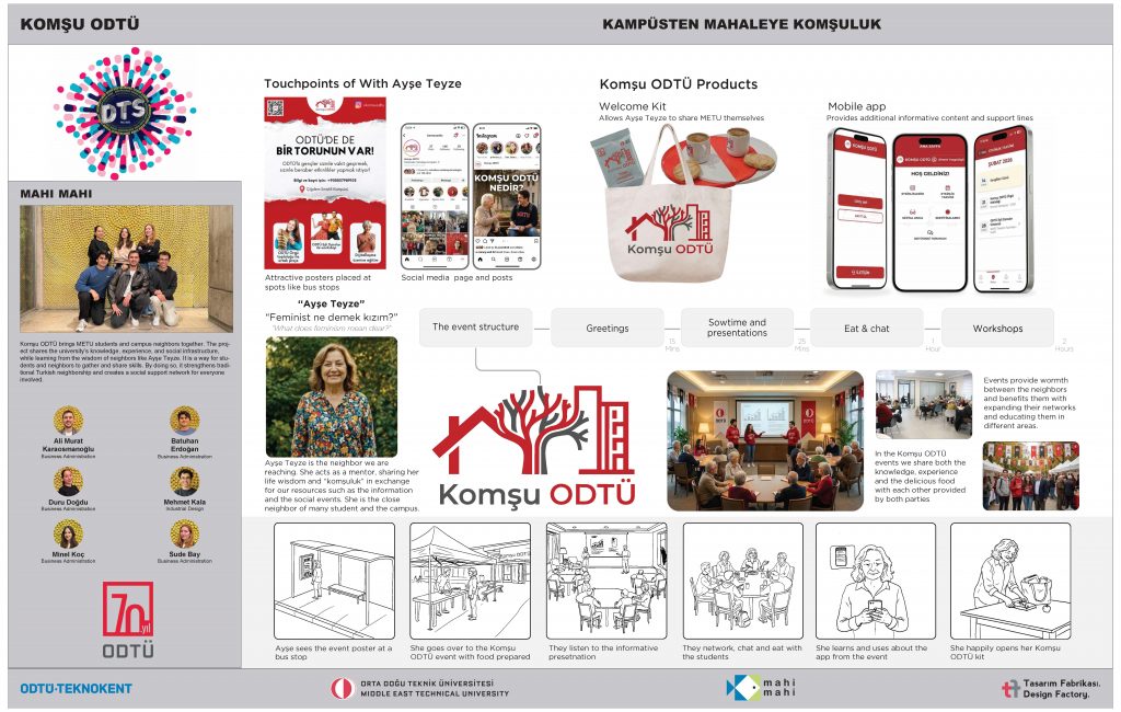 Komşu ODTÜ, kampüs çevresinde yaşayan 50–65 yaş arası bireylerle ODTÜ öğrencileri arasında güvene ve karşılıklı öğrenmeye dayalı bir bağ kurmayı amaçlayan bir projedir. Aylık yüz yüze etkinlikler, dijital bir uygulama ve sosyal medya desteğiyle, “Hocam” kültüründen ilham alan sıcak bir etkileşim ortamı oluşturur. Etkinlikler; tanışma, öğrenci kulübü performansları, atölyeler ve sohbetli yemeklerden oluşur. Kolay kullanımlı mobil uygulama; etkinlik kayıtları, iletişim araçları, dijital okuryazarlık içerikleri ve “ODTÜ’deki Torunum” adlı yapay zekâ destekli soru-cevap özelliğini içerir. Proje, kampüs ile çevresi arasındaki görünmez sınırları kaldırarak ODTÜ’yü erişilebilir bir komşuluk alanına dönüştürmeyi hedefler.